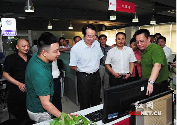 許又聲部長(左三)在中南傳媒董事龔曙光(左二)陪同下視察紅網(wǎng)