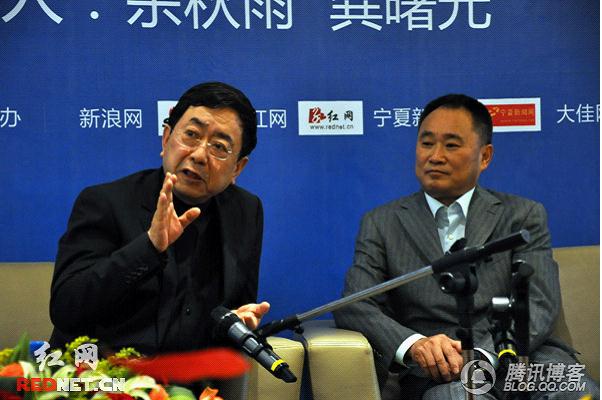 銀川書博會(huì)期間,龔曙光董事長(右)和余秋雨先生(左)就文明傳播者的當(dāng)代使命進(jìn)行對(duì)話。