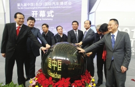 第九屆中國(guó)(長(zhǎng)沙)國(guó)際汽車博覽會(huì)開(kāi)幕,湖南省副省長(zhǎng)何報(bào)翔(左五)等領(lǐng)導(dǎo)共同啟動(dòng)象征車展開(kāi)幕的水晶球。