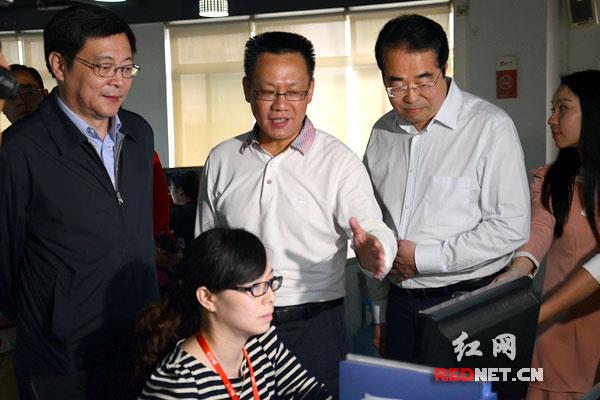 (湖南省委副書(shū)記、省長(zhǎng)杜家毫[左一],省委常委、省委宣傳部部長(zhǎng)許又聲[左三]參觀紅網(wǎng)政務(wù)中心)
