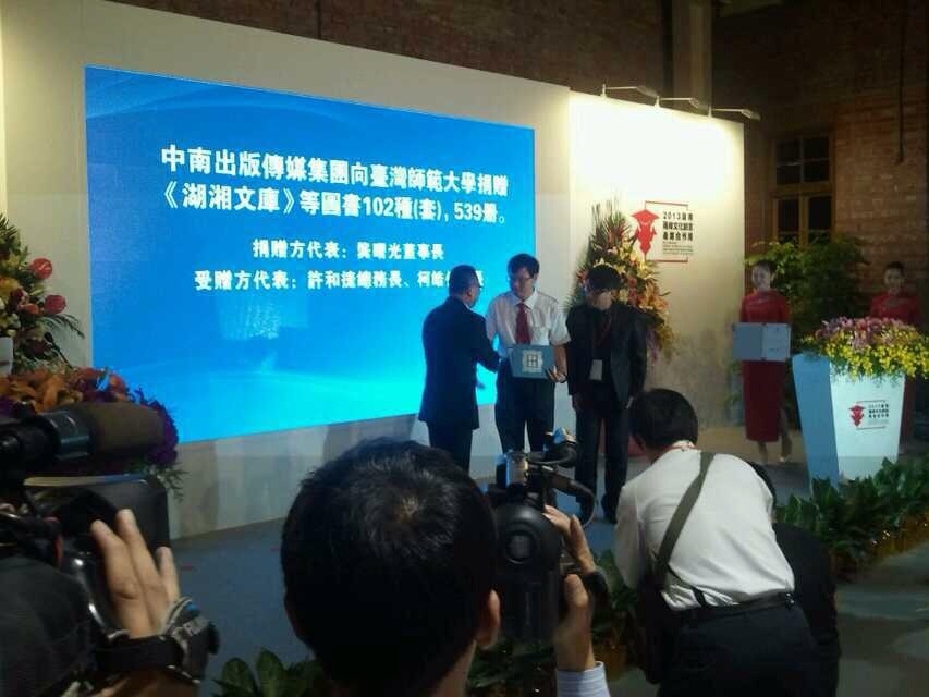 9月18日,“2013湖南兩岸文化創(chuàng)意產(chǎn)業(yè)合作周”在臺(tái)北華山文創(chuàng)園區(qū)開幕。在開幕式上,中南傳媒董事長(zhǎng)龔曙光作為捐贈(zèng)代表向臺(tái)灣師范大學(xué)捐贈(zèng)了包括《湖湘文庫》在內(nèi)的102種湘版圖書,共計(jì)539冊(cè),此次捐贈(zèng)有利于加深臺(tái)灣大學(xué)生及民眾對(duì)湖湘文化的了解和學(xué)習(xí)。
