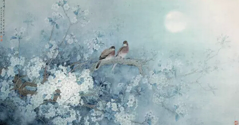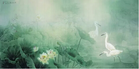作畫精于形則意味橫生,然形生于色,色定基調(diào)也。色雅則畫雅,色俗則畫俗,滿紙濃紅艷綠,則無人能賞。余常涉江南水鄉(xiāng),覽八百里洞庭、十里荷塘、武陵勝景、世外桃源,賞杏花春雨、黃鸝婉轉(zhuǎn)、燕語呢喃、絲竹盈耳,宛若置身宋詞意境,景色無不秀美清雋。遂借精工細(xì)麗的筆觸,淡雅姝麗的色調(diào),追古賢妙筆,懷古之情懷。源于此,余作畫以清為秀,以秀為高,強(qiáng)調(diào)清秀靜謐、古雅沉渾之格調(diào)。