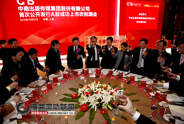 (中南傳媒慶功晚會(huì)在上海舉行。與會(huì)嘉賓舉杯慶賀中南出版?zhèn)髅郊瘓F(tuán)股份有限公司A股成功上市。 圖/瀟湘晨報(bào)滾動(dòng)新聞?dòng)浾?張必聞)