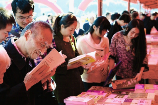 中南傳媒旗下各出版社在賀龍?bào)w育中心東廣場搭建的圖書展示臺(tái)吸引了許多讀者。啟動(dòng)儀式剛結(jié)束,許又聲一行來到展臺(tái)前,與書迷們一起分享讀書的快樂。